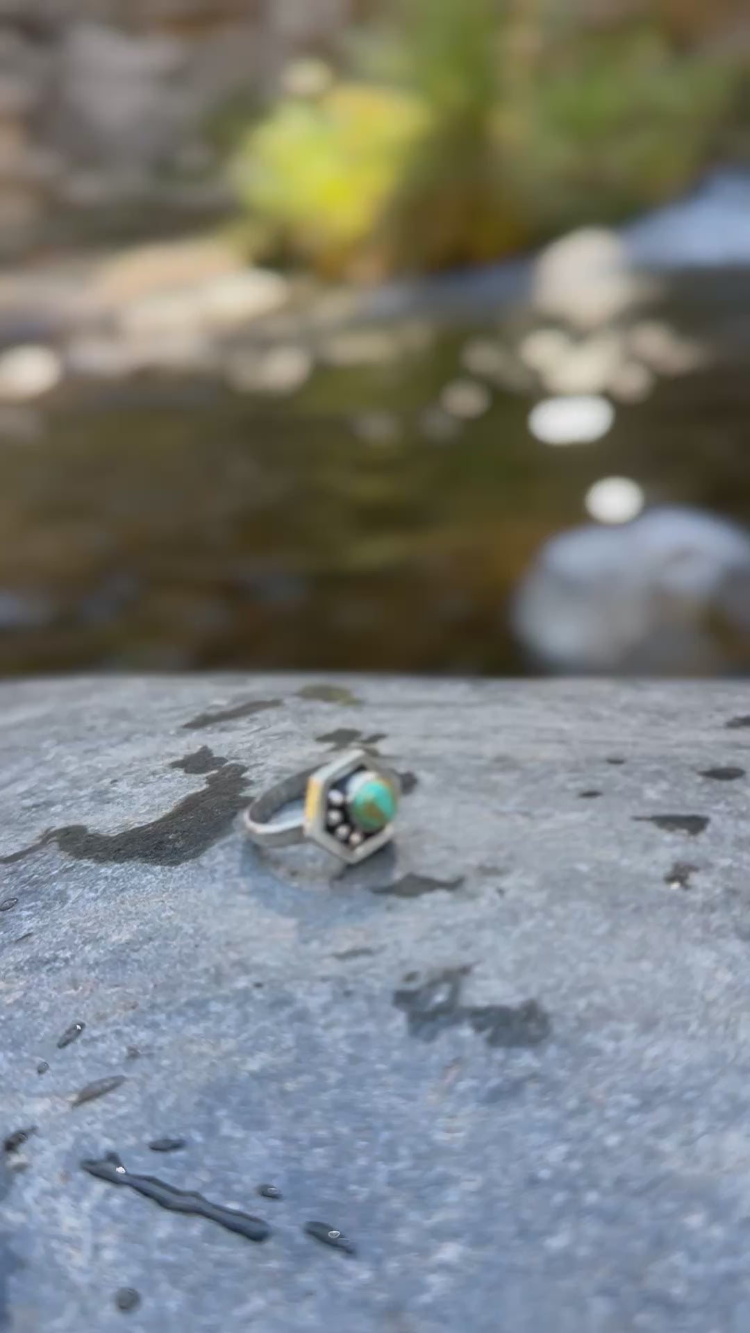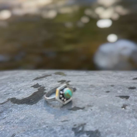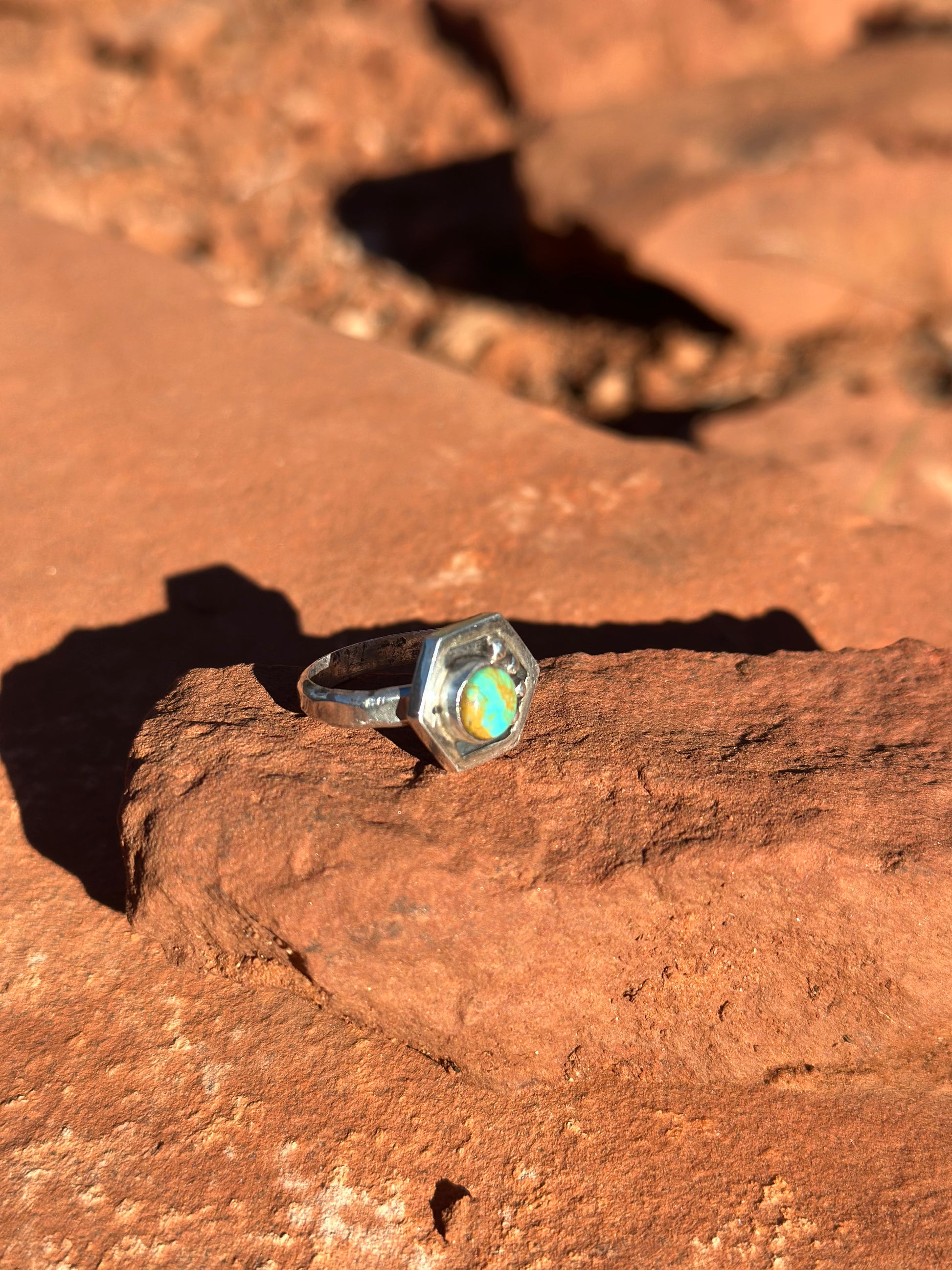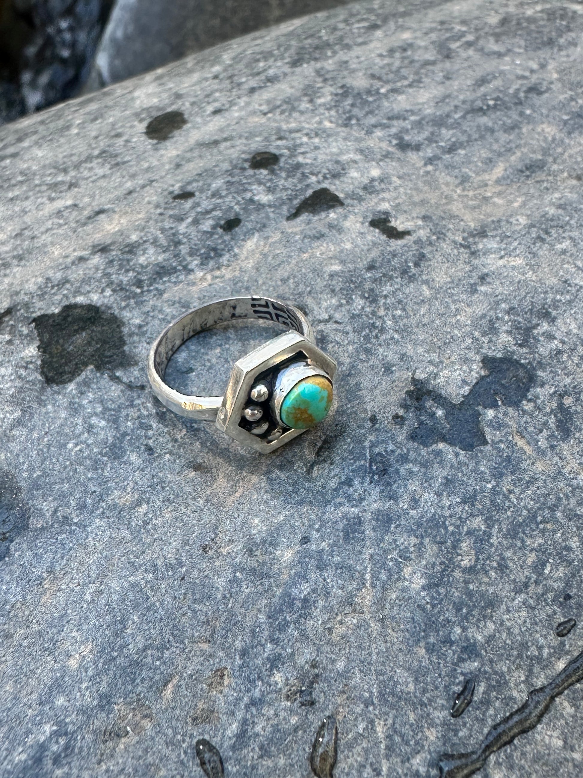 This ring is part of a collection I am working on in honor of pollinators , particularly bees. Hexagon ring representing part of a honeycomb. The 4 round embellishments represent water. As my Hopi uncles have stated time and time again , “Water is Life”