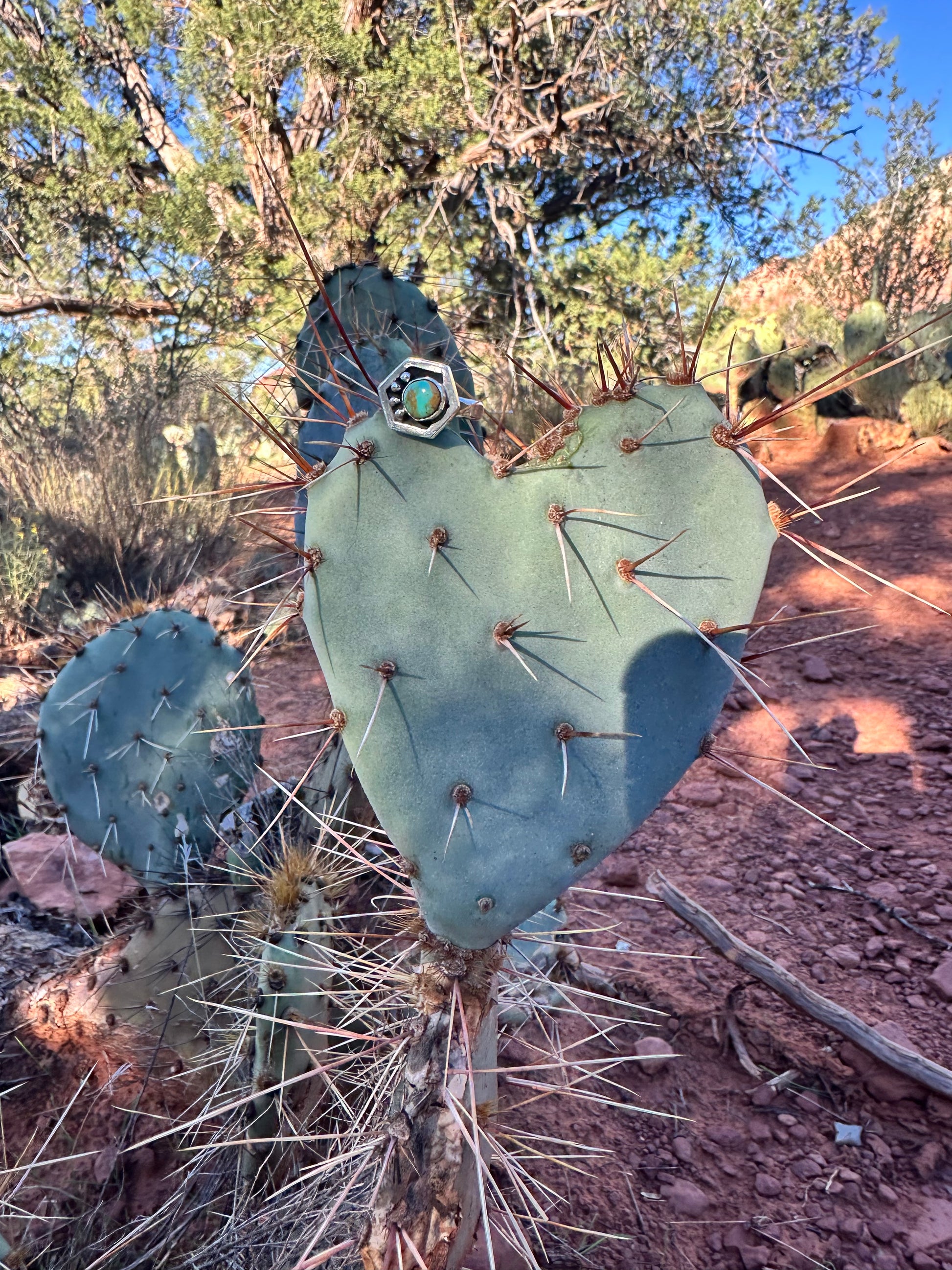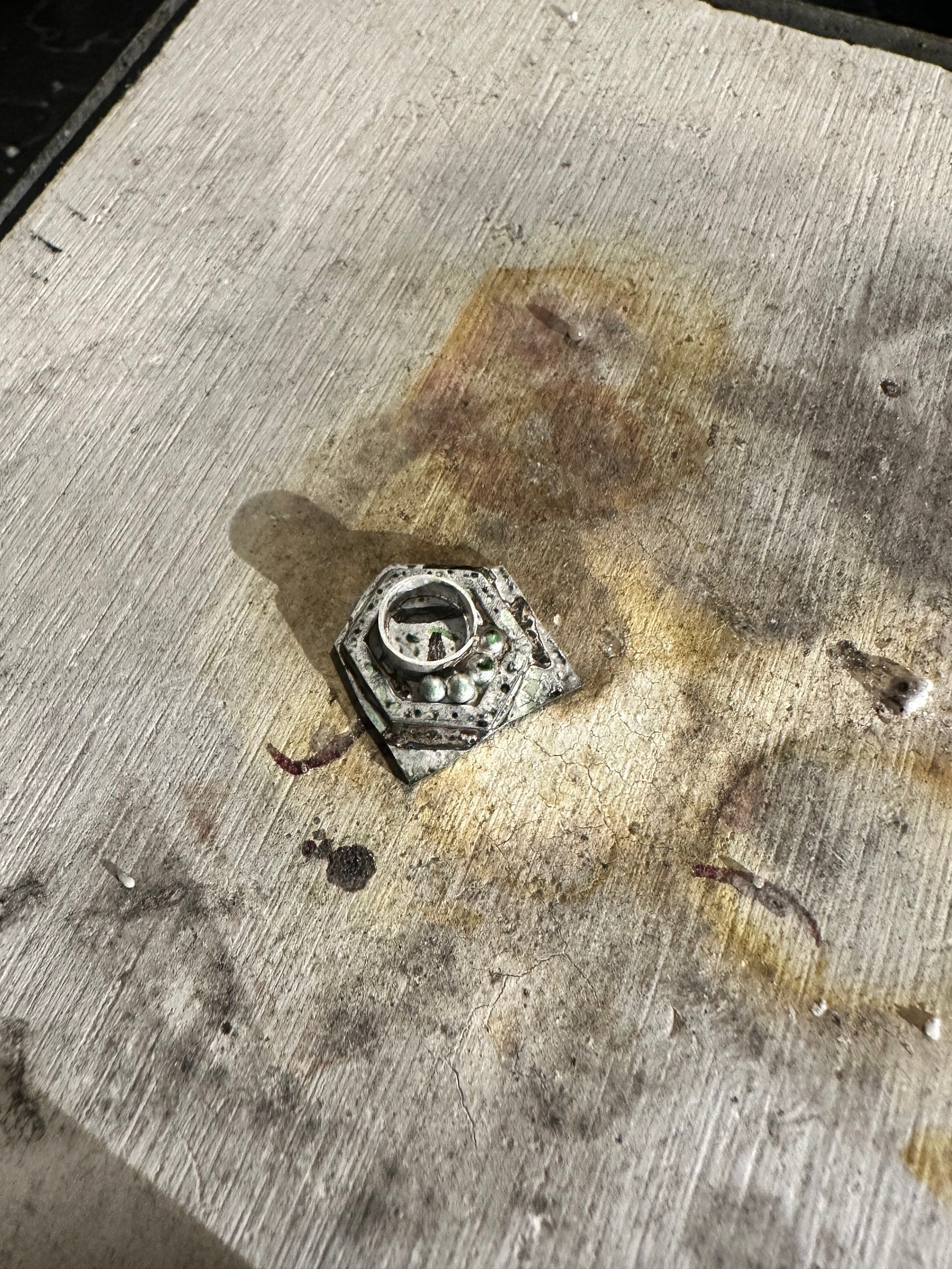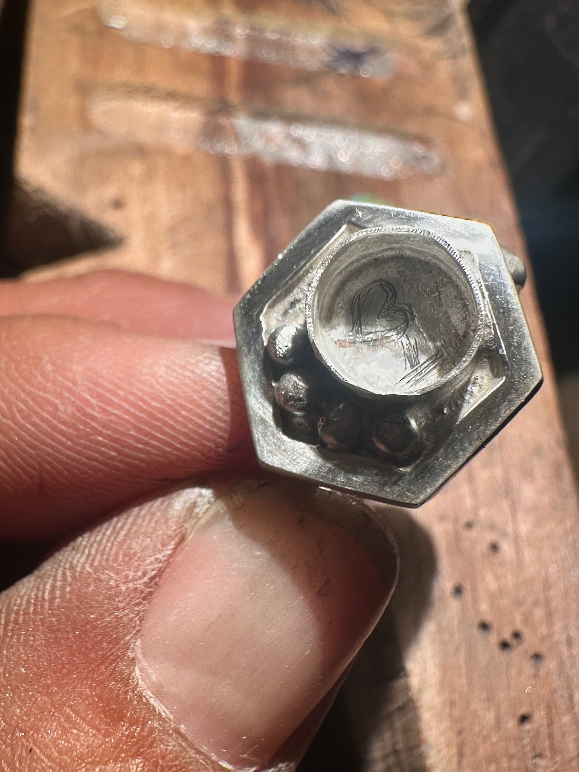 This ring is part of a collection I am working on in honor of pollinators , particularly bees. Hexagon ring representing part of a honeycomb. The 4 round embellishments represent water. As my Hopi uncles have stated time and time again , “Water is Life”